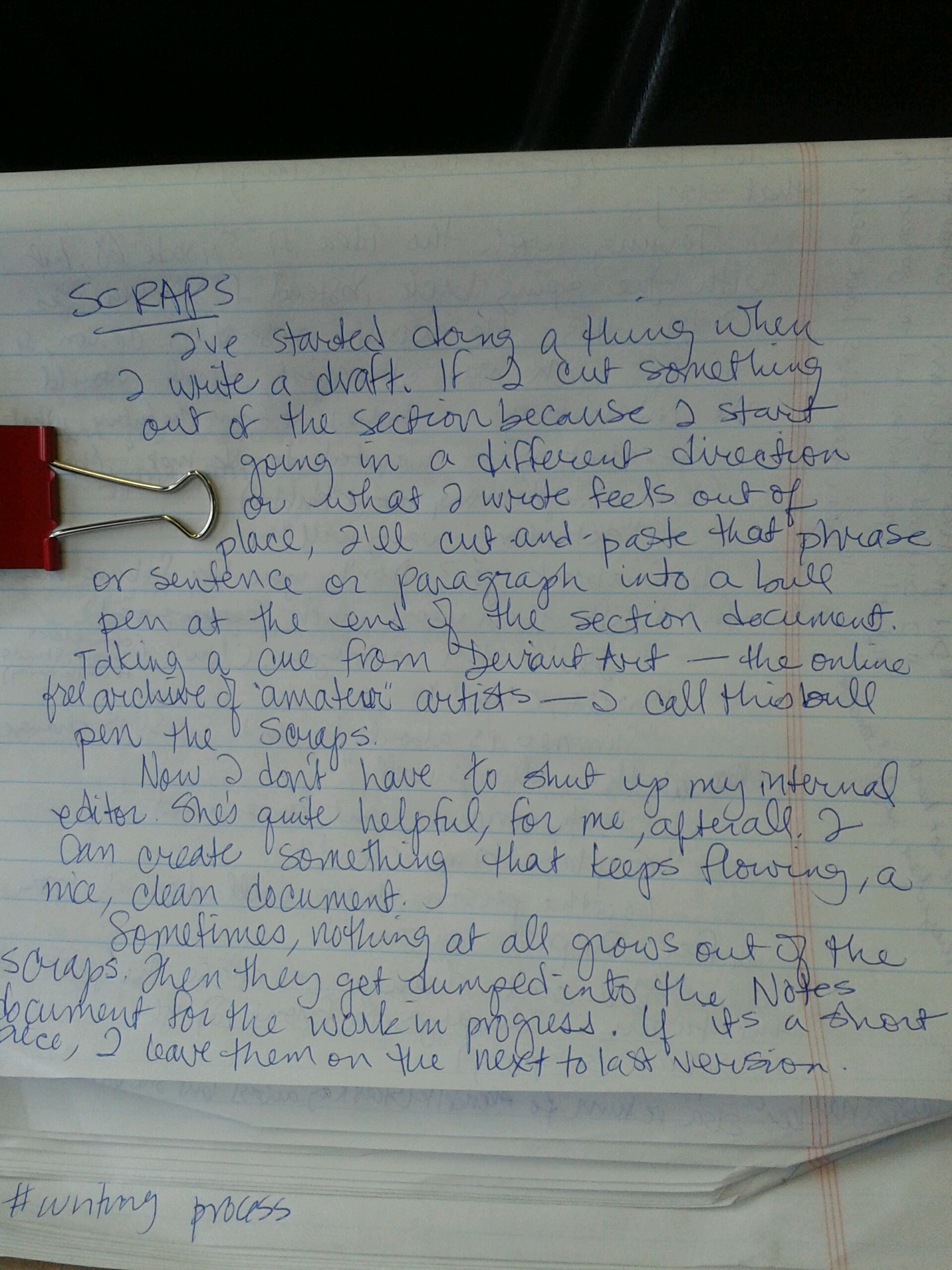I’ve started doing a thing when I write a draft. If I cut something out of the section because I start going in a different direction or what I wrote feels out of place, I’ll cut-and-paste that phrase or sentence or paragraph into a bull pen at the end of the section document. Taking a cue from Deviant Art — the online free archive of “amateur” artists — I call this bull pen the Scraps.